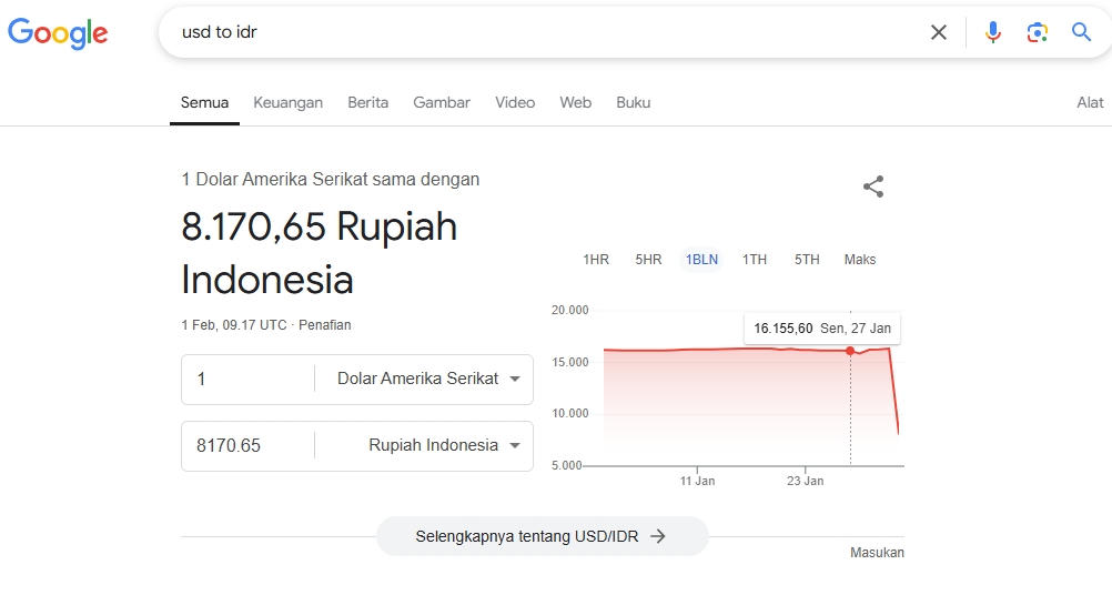 Nilai tukar saat ini adalah 1 dolar sama dengan 16358 rupiah, namun nilai tukar Google menunjukkan 1 dolar AS sama dengan 8.170,65 Rupiah Indonesia, jelas saja ini salah.